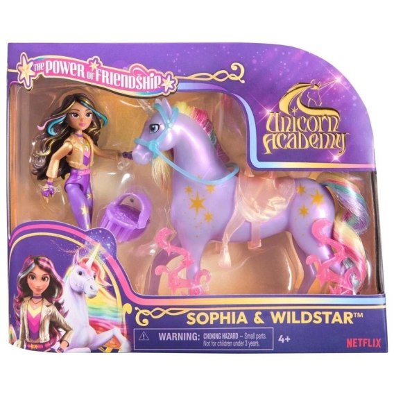 Uczcij więź między jeźdźcem a jednorożcem dzięki zestawowi Sophia i Gwiazda z serii Akademia Jednorożców Moc Przyjaźni. Zainspirowany serialem animowanym NETFLIX i ulubioną przez dzieci serią książek, w których króluje przyjaźń, zestaw ten pobudzi wyobraźnię do niekończących się opowieści. 11 cm Sophia ma realistyczne, wiernie odwzorowane detale, w tym metaliczne oznaczenia mocy i 7 punktów zgięcia dla dynamicznych póz. Gwiazda ma 12 cm wysokości i uzupełnia wygląd Sophii pięknymi detalami, w tym metalicznymi oznaczeniami magii światła i 2 półprzezroczystymi klipsami na nogach. Zadbaj o to, by grzywa Gwiazdy była lśniąca i gładka dzięki szczotce, a podczas zabawy posadź Sophię na Gwieździe i ruszaj ku przygodzie. Dzięki półprzezroczystej zdejmowanej uździe i siodle Sophia może bezpiecznie siedzieć na grzbiecie Gwiazdy. Aby uzyskać więcej sposobów na poznanie Akademii Jednorożców z ulubionymi postaciami, poszukaj innych lalek, w tym Avy, Layli, Isabel, Valentiny i ich jednorożców (zestawy sprzedawane osobno) i rozwiń swój świat. Zabawki z serii Akademia Jednorożców to wspaniałe prezenty świąteczne lub okolicznościowe dla dzieci, które lubią zabawkowe jednorożce i konie, lalki i akcesoria, domki dla lalek, przedmioty kolekcjonerskie, pluszaki i nie tylko. Przeżyj czarujące przygody w Akademii Jednorożców z zestawem Sophia i Gwiazda!