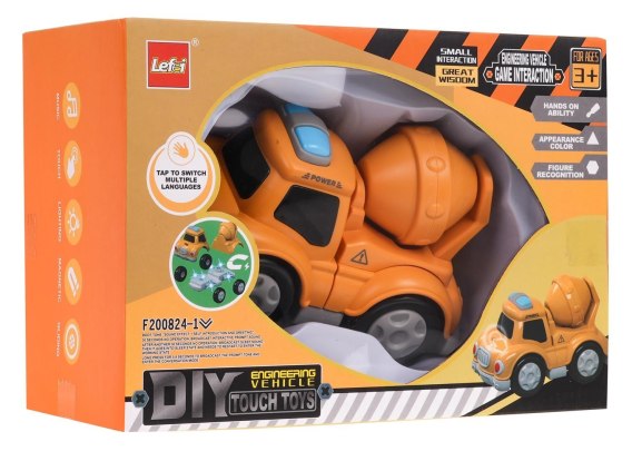 Interaktywne autko budowane, betoniarka na magnesy dla dzieci powyżej 3-go roku życia. Autko wykonane zostało z najlepszej jakości plastiku i posiada efekty dźwiękowe i świetlne. Po naciśnięciu maski pojazdu usłyszymy odgłosy, jakie wykonuje betoniarka podczas pracy, śmiech dziecka czy wesołe piosenki. Efektom dźwiękowym towarzyszyć będzie mruganie kolorowych światełek na górze pojazdu. Pojazd rozłożyć możemy na czynniki pierwsze, bez pomocy żadnego narzędzia. Poszczególne elementy posiadają magnesy, dzięki czemu łatwo i trwale łączą się ze sobą. Zabawka zasilana jest bateriami typu 3 x AG13 (w zestawie).