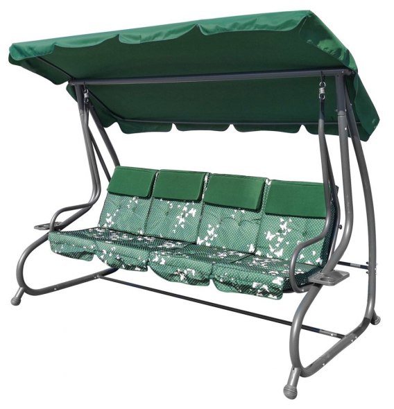 Huśtawka ogrodowa z rozkładanym siedziskiem i regulacją daszka, zielona ze wzorem