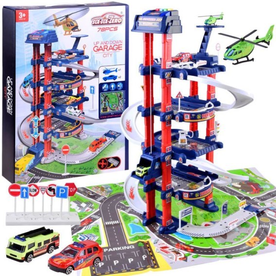 Rewelacyjny wielopoziomowy parking ze stacją benzynową, podnośnikiem, windą, warsztatem samochodowym, lądowiskiem dla helikoptera. Parking przystosowany jest do "resoraków". Za pomocą windy autko może przemieszczać się na poszczególne piętra parkingu. Jeśli braknie benzyny bez problemu zatankujesz na stacji benzynowej. Gdy chcesz naprawić swój samochód skorzystaj z podnośnika, dzięki któremu naprawisz zawieszenie czy zmienisz oponę. Zestaw zawiera wiele dodatkowych elementów wspaniale urozmaicających zabawę, takich jak znaki drogowe, pachołki.