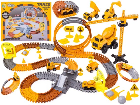 Zestaw oprócz głównego pojazdu zasilanego, który porusza się bezpośrednio po torze wyposażony został w dwa resoraki. Każdy z nich jest wyjątkowy. Jak na placu budowy tak i w naszym zestawie nie zabrakło koparki oraz wywrotki. Dodatkowo posiadają one ręczny napęd, który sprawi, że puszczone w ruch nie zatrzymają się szybko :)