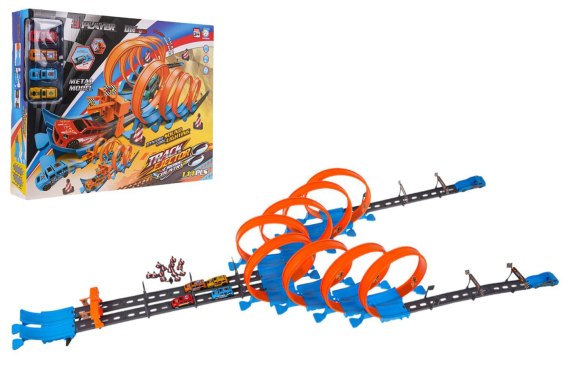 Ekstremalny, interaktywny tor wyścigowy z metalowymi autkami w zestawie dla dzieci powyżej 3-go roku życia. Zestaw składa się z 111 elementów do samodzielnego montażu. Po zbudowaniu tor posiada mnóstwo pętli 360 stopni. W zestawie znajdują się cztery pojazdy z metalową karoserią. Tor wyposażono w efekty dźwiękowe i świetlne takie jak wesołe melodie, odgłosy jazdy, klakson oraz mrugające światełka. Zabawka zasilana jest bateriami typu 3 x LR41 - maszt (baterie w zestawie) oraz 9 x LR44 - plastikowe autka (baterie w zestawie).