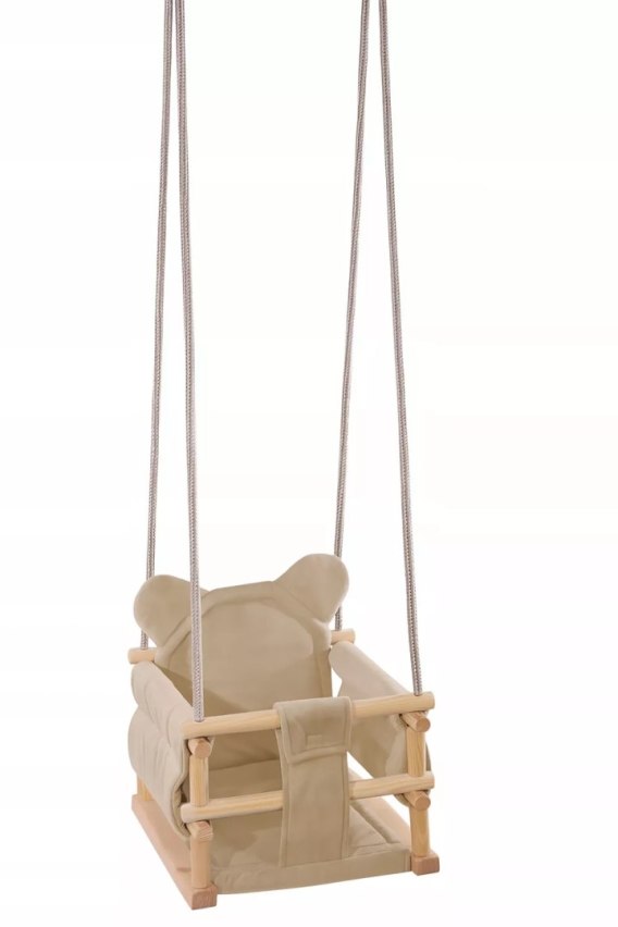 Produkt został wykonany z naturalnego, surowego drewna, które nie było impregnowane ani lakierowane - dzięki temu jest w pełni bezpieczne dla delikatnej skóry dziecka. Konstrukcja z zaokrąglonymi szczebelkami ogranicza ryzyko urazów i zabezpiecza malucha przed wypadnięciem z siedziska. Dołączona do zestawu gruba, miękka poduszka z oparciem w formie sympatycznej głowy misia zapewnia dziecku komfort podczas huśtania się i tworzy przytulną przestrzeń do zabawy.