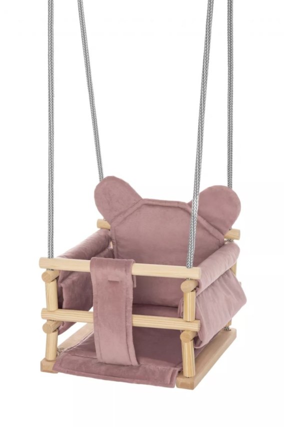 Produkt został wykonany z naturalnego, surowego drewna, które nie było impregnowane ani lakierowane - dzięki temu jest w pełni bezpieczne dla delikatnej skóry dziecka. Konstrukcja z zaokrąglonymi szczebelkami ogranicza ryzyko urazów i zabezpiecza malucha przed wypadnięciem z siedziska. Dołączona do zestawu gruba, miękka poduszka z oparciem w formie sympatycznej głowy misia zapewnia dziecku komfort podczas huśtania się i tworzy przytulną przestrzeń do zabawy.