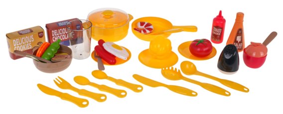 Interaktywna kuchnia z funkcją światła, dźwięku i kranikiem, z którego wydobywa się woda, a także mnóstwem akcesoriów, dla dzieci od 3-go roku życia. Kuchnia została znakomicie wykonana, z najlepszej jakości plastiku i jest w żywych kolorach zachęcających dziecko do zabawy. Na blacie kuchni znajduje się interaktywna płyta z palnikami. Po przekręceniu jednego z pokręteł słychać odgłosy gotowania, a drugiego, odgłosy smażenia. Odgłosom gotowania i smażenia towarzyszy podświetlenie palników. Z kranu faktycznie wypływa woda, jak w prawdziwym zlewie, dziecko będzie mogło umyć zabawkowe naczynia. W zestawie mamy też atrapę lodówki z otwieranymi drzwiczkami oraz półeczki, na których ułożyć możemy atrapy produktów. Cały zestaw prezentuje się znakomicie. Zabawka zasilana jest bateriami typu 3 x AA 1,5 V (brak w zestawie).