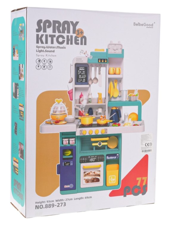 Interaktywna kuchnia z funkcją światła, pary wodnej, dźwięku i kranikiem, z którego wydobywa się woda, a także mnóstwem akcesoriów, dla dzieci od 3-go roku życia. Kuchnia została znakomicie wykonana, z najlepszej jakości plastiku i jest w żywych kolorach zachęcających dziecko do zabawy. Na blacie kuchni znajduje się interaktywna płyta z palnikami. Po przekręceniu jednego z pokręteł słychać odgłosy gotowania, a drugiego, odgłosy smażenia. Odgłosom gotowania i smażenia towarzyszy podświetlenie palników. Dodatkowo z garnka wydobywa się zimna para wodna. Z kranu faktycznie wypływa woda, jak w prawdziwym zlewie, dziecko będzie mogło umyć zabawkowe naczynia. Do zestawu dołączono również tablicę kredową, na której można przygotować np. przepis lub listę na zakupy. W zestawie mamy też atrapę lodówki z otwieranymi drzwiczkami, otwierany piekarnik i szufladka oraz mnóstwo półeczek, na których ułożyć możemy atrapy produktów. Jajowar dołączony do zestawu, posiada obrotową górną część oraz dźwięki i światełka. Na górze zestawu kuchennego znajduje się panelik muzyczny z przyciskami uruchamiającymi różne melodie. Cały zestaw prezentuje się znakomicie. Zabawka zasilana jest bateriami typu 8 x AA 1,5 V (brak w zestawie).