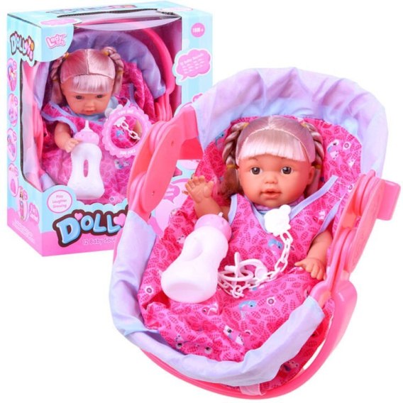 Uroczy zestaw dla każdej małej mamusi, tatusia. Zestaw składający się z lalki i nosidełka sprawdzi się podczas podróży, spaceru. Zestaw z akcesoriami to zestaw wymarzony dla każdej przyszłej mamy, rodzica. Laleczka z długimi blond włosami, potrafi gaworzyć, śmiać się jak niemowlaczek.Po napojeniu jej płynem siusia. Cała lalka wykonana jest z plastiku, posiada ruchome kończyny, twarz lalki jest gumowa. Nosidełko świetnie wykonane z plastiku. Posiada ruchome rączki, szelki do przypięcia np. do walizki. Dodatkowo zestaw zawiera akcesoria do karmienia niemowlaka. Pełen kompaktowy zestaw sprawdzi się w każdym małym pokoju dziecięcym. Dzięki temu iż nosidełko jest dość duże zmieści się w niej lalka ze wzrostem do 30cm!