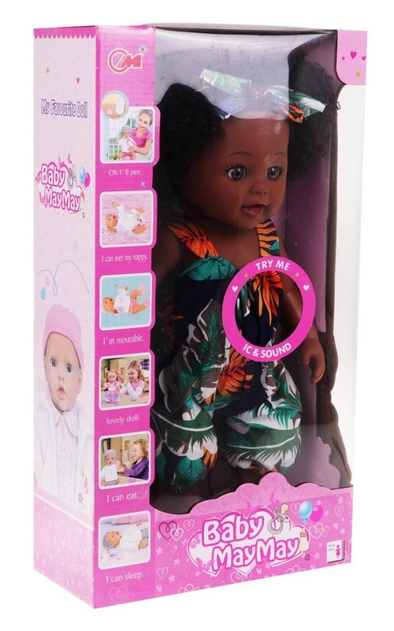 Śliczna, duża lalka, dla dziecka od 3-go roku życia. Lalka jest perfekcyjnie wykończona, z dbałością o każdy szczegół i w pełni bezpieczna dla dziecka. Ubrana jest w kombinezon letni, sandałki i ma opaskę na bujnych włosach. Ubranka możemy zdejmować i przebierać lalkę w inne. Ruchome nóżki i rączki, ułatwiają przebieranie. Na brzuszku lalki znajduje się panel dźwiękowy, po naciśnięciu, na który lala wydaje różne odgłosy. Zabawka zasilana jest bateriami typu 3 x AG13 (w zestawie).