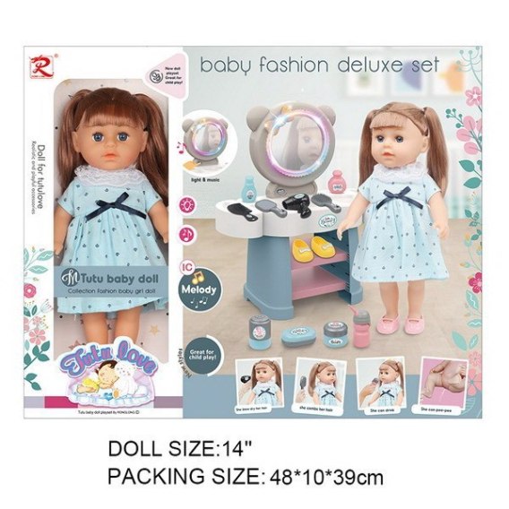 Zestaw, interaktywna toaletka z lalką robiącą siusiu dla dzieci od 3-go roku życia.  Toaletka wykonana została z najlepszej jakości plastiku, w żywych kolorach. Posiada podświetlane lustro, efekty dźwiękowe, blat na akcesoria i dwie półeczki. Laleczka dołączona do zestawu ma przyjemną w dotyku buzię, śliczne włosy, idealne do czesania, ruchome rączki i nóżki. Ubrana jest w sukienkę i butki. Lalka po napojeniu ją wodą, robi siusiu, na jej brzuszku znajduje się panel uruchamiający efekty dźwiękowe w postaci odgłosów płaczu, śmiechu, spania, marudzenia i innych wydawanych przez dziecko. W zestawie znaleźć możemy również pojemniczek do pojenia lali, mydelniczkę, pudełko na maść, pudełko na zasypkę, flakoniki z perfumami, pantofelki na zmianę, suszarkę, lusterko, grzebyk i szczotkę do włosów. Toaletka zasilana jest bateriami typu 4 x AA 1,5 V (brak w zestawie), lalka bateriami typu 3 x LR44 (w zestawie).