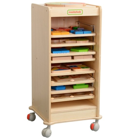 Drewniana szafeczka została zaprojektowana specjalnie w celu przechowywania ręcznych tabliczek Masterkidz. Mieści aż 10 sztuk o rozmiarach 28x28cm, więc jest to bardzo praktyczne rozwiązanie. Do szafeczki można dokupić kółka, dzięki którym przenoszenie szafeczki będzie dużo łatwiejsze, nawet gdy będzie pełna. Kółka można zablokować, by można było unieruchomić mebel, bez potrzeby demontowania kół.