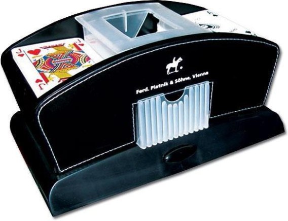 Automatyczna maszynka do tasowania kart. Wystarczy wcisnąć guzik, by talia została potasowana.