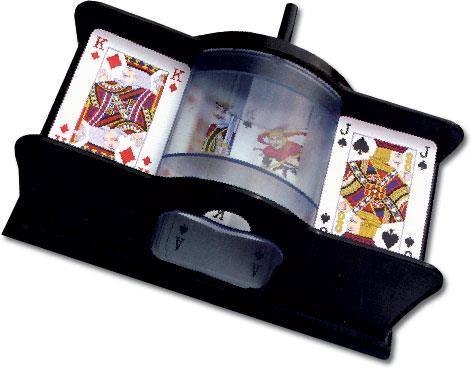 Tradycyjna maszynka do tasowania kart. Nie wymaga baterii. Wystarczy zakręcić korbką, by talia została potasowana.