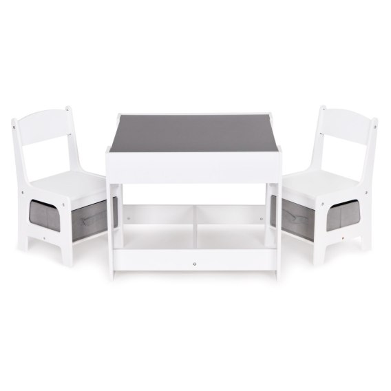 Wspaniały zestaw dla wszystkich maluchów, dzięki swojej prostej formie idealnie wpasuje się w wystrój dziecięcych pokoików, sal zabaw, czy poczekalni. Zestaw wykonany jest z MDF-u co sprawia, że jest odporny na uszkodzenia/zarysowania. Uzupełnieniem zestawu są dwa stabilne i wygodne krzesełka, które posiadają funkcjonalne kosze pod siedziskiem, idealne do przechowywania zabawek.