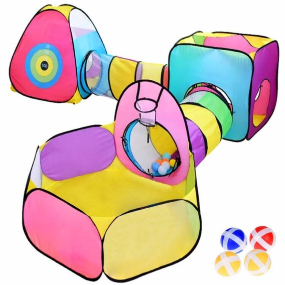 Namiot trójkątny: Posiada tarczę do strzelania piłeczkami z rzepami oraz specjalne otwory, dopasowane do kolorów piłeczek. Namiot kwadratowy: Z dwoma wejściami i możliwością łączenia namiotów za pomocą tuneli. Namiot basen/kojec na piłeczki Z pojemnikiem na duże ilości piłeczek i koszem do rzucania piłeczek (piłeczek brak w zestawie).