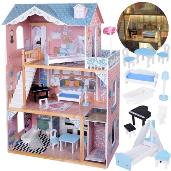 Niezwykle duży, drewniany domek w stonowanych, pastelowych kolorach to wymarzona zabawka dla każdej małej dziewczynki. Dzięki solidnej konstrukcji i eleganckiemu designowi domek ten zapewni wiele lat kreatywnej zabawy.
