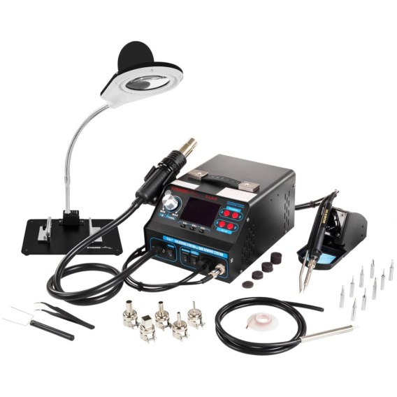 Stacja lutownicza została zaprojektowana z myślą o wykonywaniu różnych prac z dzieciny elektroniki, także obróbki tworzyw sztucznych. Wysoka moc stacji wynosi 720 W. Moc kolby lutowniczej wynosi 75W, a kolby na gorące powietrze 550W. Praktyczne pokrętło pozwala na regulację ilości powietrza. Funkcja Cool schładza kolbę i wydłuża czas eksploatacji. Regulacja temperatury w zakresie 100 do 480deg;C następuje za pomocą pokręteł z przodu urządzenia. Duży wyświetlacz LCD z podświetlaniem umożliwia łatwy odczyt parametrów. Urządzenie posiada opcję pamięci i trzy przyciski do zapisu danych. Odsysanie dymów lutowniczych odbywa się za pomocą specjalnej rurki. Funkcję włącza się przyciskiem, a siłę zasysania reguluje pokrętłem. Funkcja Sleep powoduje zmniejszenie temperatury kolby po odłożeniu na podstawkę z gąbką a następnie wyłączenie w ustawionym czasie. Ponowne jej podniesienie włącza urządzenie. Akcesoria znajdujące się w zestawie ułatwiają działanie i obniżają koszty użytkowania stacji lutowniczej. W komplecie stacja z kolbami, lampa ze szkłem powiększającym, 9 grotów lutowniczych, 5 dysz gorącego powietrza, pęsetę, podnośnik do komponentów IC popper oraz taśmę do rozlutowywania. Rączka sprawia, ze stacja jest łatwa w transporcie.
