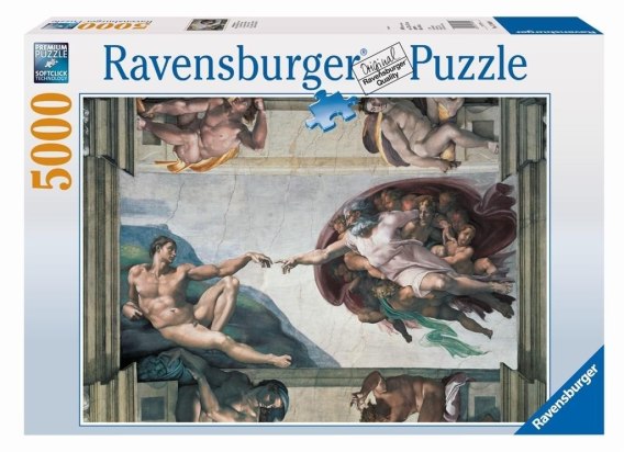 Puzzle 5000 elementów z ilustracją fresku "Stworzenie Adama" Michała Anioła to wyjątkowe puzzle z unikalnym wzorem. Po ułożeniu puzzle mają wymiary 153 x 101 cm.