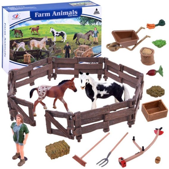 - Elementy zagrody - w zestawie znajdują się taczki, korytko, widły, miotła i kosiarka, które pozwolą dziecku na odtworzenie codziennej pracy na farmie.
