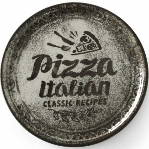 Talerz do pizzy Recipe Collection Black firmy HENDI dzięki swojemu idealnie płaskiemu kształtowi i średnicy jest idealny do serwowania pizzy. Wyróżnia się wyjątkowym wzorem z napisem i rysunkiem pizzy, na czarnym marmurkowym tle. Dekoracje są wykonane pod szkliwem, dzięki czemu można bez obaw myć talerz w zmywarce.