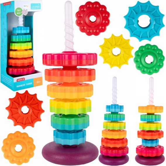 Wieża Zakręcona Piramidka Sensoryczna to kolorowa, ruchoma układanka składająca się z 6 tęczowych krążków, które nakłada się na spiralny słupek. Każdy obrót to nowa porcja radości, bodźców i nauki poprzez zabawę!