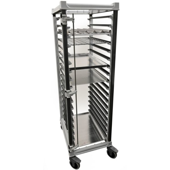 to wygodne rozwiązanie pozwalające na sprawny transport wielu tac cukierniczych jednocześnie. Wózek posiada specjalne prowadnice dostosowane do uniwersalnych pojemników. Wykonany został z kompozytu - bez ostrych krawędzi, dzięki czemu jest łatwy w czyszczeniu, odporny na działanie kwasów spożywczych i substancji chemicznych. Prowadnice zakończone 3-mm blokadami zatrzymują tace podczas skręcania lub przemieszczania wózka. Wózek wyposażony został w górną ramkę do umieszczenia pojemnika/tacy lub deski do krojenia w celu zabezpieczenia zawartości wózka lub stworzenia małej dodatkowej przestrzeni do pracy. 4 skrętne kółka o średnicy 12,5 cm z hamulcami zostały wykonane z gumy termoplastycznej, dzięki czemu są bardzo ciche. Wózek przeznaczony jest do samodzielnego montażu.