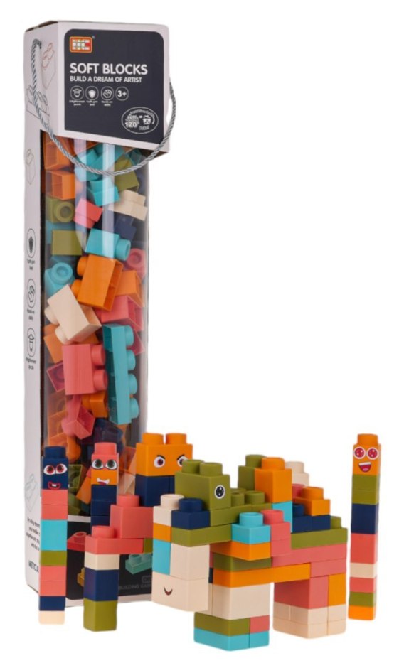 Zestaw kolorowych miękkich klocków dla dzieci od 3-go roku życia. Zestaw wykonanoz bezpiecznego dla dzieci i środowiska materiału PVC. Klocki są lekkie i nie posiadają ostrych zakończeń. Bardzo łatwo je utrzymać w czystości, po wyparzeniu, nie tracą kolorów. Klocuszki możemy dowolnie wyginać, a po wygięciu wracają do swojego poprzedniego kształtu.
