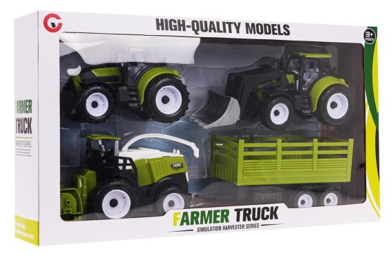 Zestaw pojazdów rolniczych dla dzieci powyżej 3-go roku życia. Zestaw wykonano z najlepszej jakości plastiku. W zestawie znaleźć możemy dwa traktory, kombajn i przyczepę. Traktorki i kombajn zostały wykonane bardzo realistycznie z dbałością o szczegóły. Przyczepkę możemy doczepiać zarówno do traktorków jak i kombajnu.