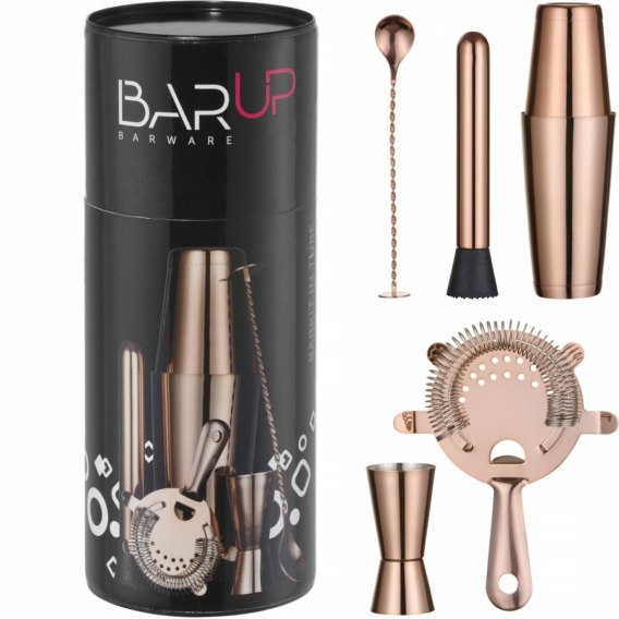 Kod producenta: 596623 Zestaw barmański w tubie firmy BarUp, to starannie przemyślany i skomponowany zestaw podstawowych, profesjonalnych i niezbędnych narzędzi barmana. Zamknięty jest w estetycznym, tekturowym pudełku w formie tuby, dzięki czemu to również wspaniały pomysł na prezent dla pasjonatów sztuki barmańskiej.Zestaw 5 elementów został wykonany ze stali nierdzewnej AISI 201 z powłoką w kolorze miedzianym z błyszczącym wykończeniem.Shaker bostoński Tin-on-Tin posiada 2 kubki z obciążeniem, o pojemnościach 500 ml i 800 ml. Klasyczny jigger o pojemnościach 50 ml i 25 ml. Sitko barmańskie Hawthorne z profilowanym uchwytem oraz demontowaną sprężyną (ułatwia czyszczenie, można jej też używać jako „spring whisk#8221;) idealnie pasuje do shakera, doskonale odcedza drobne kawałki lodu, owoców i ziół. Muddler (moździerz barmański) z ząbkowaną powierzchnią, do szybkiego rozgniatania kawałków owoców i ziół. Końcówka muddlera wykonana jest z polipropylenu (PP).Spiralna łyżka barmańska o długości 27 cm i pojemności 5 ml z muddlerem (końcówka w kształcie dysku) do szybkiego mieszania drinków z lodem bez rozwadniania ich, do wlewania napojów gazowanych bez spieniania oraz tworzenia warstwowych koktajli. Zestaw umieszczony jest w kartonowej tubie z elegancką grafiką. Elementy zestawu nie nadają się do mycia w zmywarce. Cechy produktu: