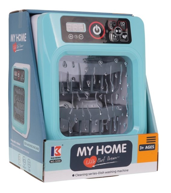 Interaktywna zmywarka z funkcją dźwięku i światła dla dzieci powyżej 3-go roku życia. Zmywarka posiada panel dotykowy, dzięki któremu można włączać i wyłączać ją oraz zmieniać program. Podczas pracy zmywarki słychać szum wody, odgłos wyparzania oraz dźwięk zakończonej pracy. Dodatkowo możemy ustawiać czas pracy zmywarki. Drzwi zmywarki są otwierane, można wyjąć ze środka kosze, aby sprawniej wkładać naczynia znajdujące się w zestawie. Do zestawu dołączono naczynia takie jak kubki, talerze, łyżki, widelce, noże. Zabawka zasilana jest bateriami typu 2 x AA (brak w zestawie).