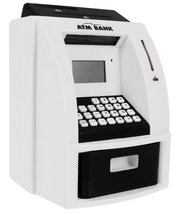 Skarbonka w kształcie bankomatu z kartą bankomatową i blokadą na PIN