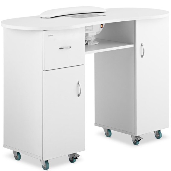 Kod producenta: 10040450 Biurko kosmetyczne marki Physa pozwala na wygodną stylizację paznokci oraz manicure w salonach urody. Blat stolika posiada wymiary 120 x 50,3 cm. Potrzebne przybory można schować w szufladzie, szafkach i na półkach, co pozwala na zachowanie porządku. Dodatkowy komfort podczas zabiegów zapewnia dołączona podpórka pod nadgarstki. Mebel wyposażony został w gumowe kółka, z czego dwa posiadają hamulce. Zintegrowany pochłaniacz pyłu, gładkie powierzchnie i minimalistyczna konstrukcja sprawiają, że biurko jest łatwe w utrzymaniu czystości. Cechy produktu: