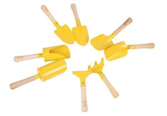 - Narzędzia wykonane z wytrzymałego metalu w intensywnym żółtym kolorze oraz drewnianych uchwytów