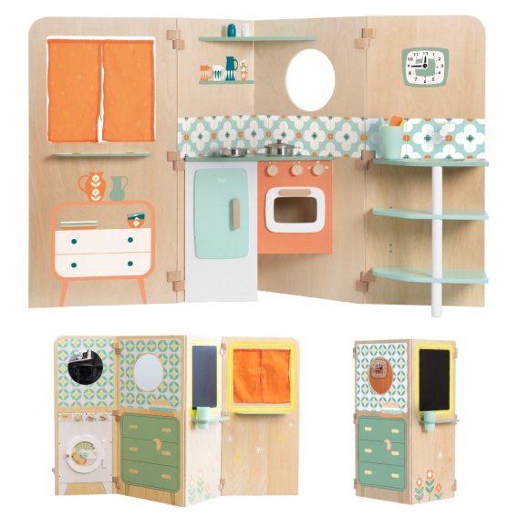 Wielofunkcyjny składany domek od marki CLASSIC WORLD daje nieograniczone możliwości zabawy. Odsłania różne przestrzenie do zabawy, takie jak kuchnia, a także pralnia z pralką, tablica magnetyczna i okno. Może być również wykorzystywany jako teatr kukiełkowy. Dzieci mogą bawić się „na zewnątrz" i „wewnątrz", patrząc przez okno. Składany domek jest bardzo kompaktowy a dzięki dobremu systemowi otwierania i składania, nie zajmuje dużo miejsca.