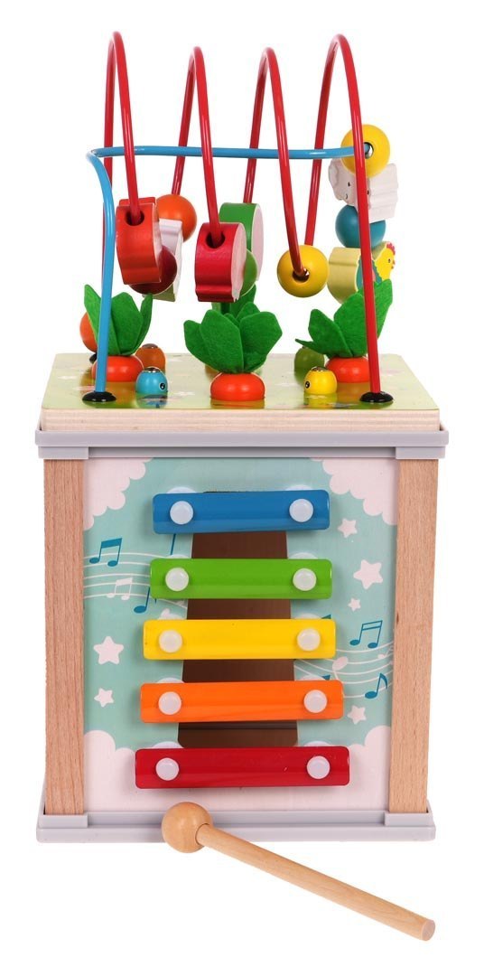 Drewniana, kolorowa bezpieczna kostka dla dzieci powyżej trzeciego roku życia. Zabawa tą kostką pobudza wyobraźnię i kreatywność. Maluszek ćwiczy zdolności manualne i koordynację wzrokowo-ruchową, uczy się rozpoznawać kolory i kształty. Drewniana kostka i jej elementy wykonane zostały z wysokiej jakości drewna, malowanego bezpieczną farbą, są trwałe i odporne na uszkodzenia, zabawka posłuży latami. Kostka składa się z sześciu pobocznych ścian. Na pięciu ścianach kostki znajdują się różne atrakcje.