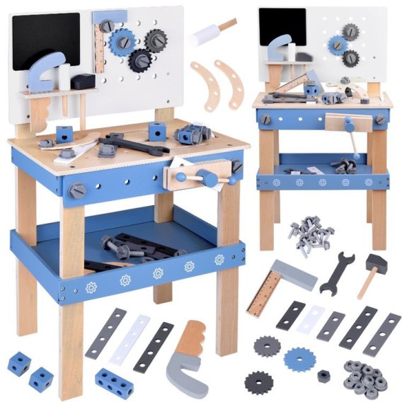 Ten drewniany warsztat to idealna zabawka edukacyjna dla małych majsterkowiczów. Zestaw został zaprojektowany z myślą o rozwijaniu umiejętności manualnych oraz wyobraźni u dzieci, a także wprowadzaniu ich w świat narzędzi i majsterkowania. Wykonany z solidnego drewna, warsztat jest trwały, bezpieczny i estetyczny, a jego naturalne kolory w połączeniu z niebieskimi akcentami przyciągną uwagę każdego dziecka.