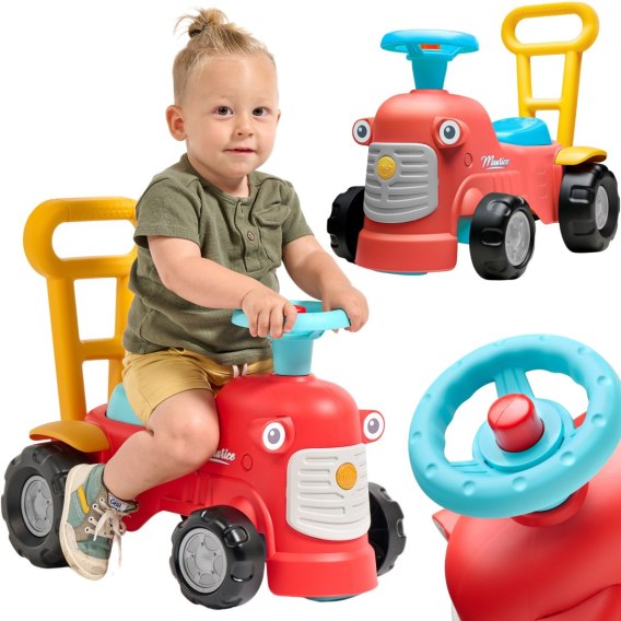 Maurice to uroczy traktorek francuskiej marki Falk, który będzie towarzyszem pierwszych kroków Twojego dziecka. Jasne kolory i zaokrąglone kształty zachwycą każdego malucha. Uruchamianie traktora za pomocą małego pokrętła dźwiękowego oraz dźwięk z klaksonu umieszczonego na kierownicy to wspaniała pierwsza nauka, która pobudzi umiejętności motoryczne i słuch Twojego dziecka. Jeżdżąc na jeździku, bawiąc się kierownicą z klaksonem i skrętnymi kołami dziecko będzie ćwiczyło koordynację i równowagę. Stojąc z tyłu, może korzystać z ergonomicznego oparcia, aby uczyć się chodzić przez zabawę, bez strachu i całkowicie bezpiecznie. Pod siedzeniem znajduje się niewielki schowek do przechowywania skarbów.