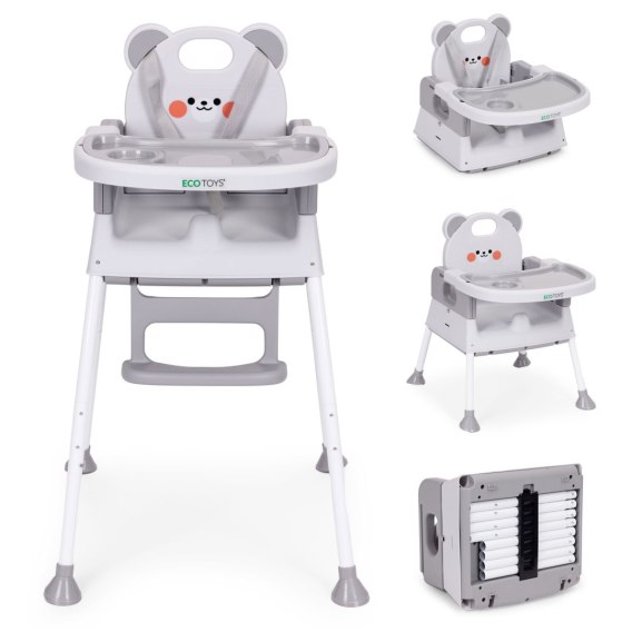 FOTELIK KRZESEŁKO DO KARMIENIA DZIECI 3W1 PODWÓJNA TACKA 5-PUNKTOWE PASY SZARY ECOTOYS