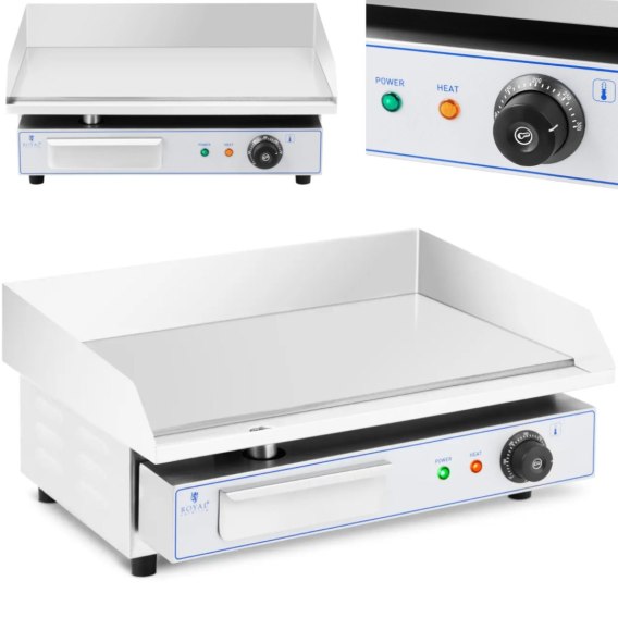 Kod producenta: 10012370 Płyta grillowa marki Royal Catering pozwala przyrządzić soczyste steki i hamburgery, ryby, omlety, tortille czy warzywa. Urządzenie imponuje niskim poziomem wydzielania dymu oraz higienicznym i bardzo czystym sposobem pracy. Doskonale nadaje się do zastosowania w dużych kuchniach - od restauracji i barów z przekąskami po food trucki lub imprezy z cateringiem. W pełni automatyczny termostat zapewnia utrzymanie stałej temperatury. Dzięki wydajnemu elementowi grzewczemu o mocy 3000 W płyta szybko osiąga temperaturę roboczą w zakresie 50-300deg;C. Poziom grzania można ustawić za pomocą poręcznego pokrętła. Powierzchnię grillową wykonano ze stali, która szybko przenosi ciepło z elementów grzewczych na żywność i jednocześnie je utrzymuje. Płyta o grubości 10 mm ma rozmiar 550 x 400 mm. Dzięki gładkiej powierzchni grill elektryczny doskonale nadaje się do przygotowania jajek sadzonych lub naleśników. Urządzenie posiada osłonę przeciwbryzgową, która skutecznie chroni ściany i otoczenie przed rozpryskami tłuszczu. Obudowę wykonano z wysokiej jakości stali nierdzewnej i dlatego jest szczególnie odporna na korozję, neutralna w kontakcie z żywnością oraz łatwa do czyszczenia. Cechy produktu: