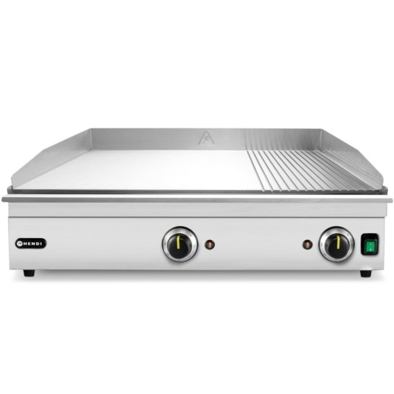 Kod producenta: 154960 Płyta grillowa w ⅓ żebrowana firmy HENDI wyróżnia się wykonaniem z hartowanej stali nierdzewnej i możliwością osiągnięcia temperatury aż do 300deg;C, co sprawia, że jest idealna do przygotowywania tłustych mięs, na przykład burgerów i kiełbasek. Równocześnie, gładka strona grilla idealnie sprawdzi się również do przyrządzania jajek lub pankejków. Połączenie rantu tylnego i wyjmowanej szuflady na tłuszcz sprawia, że urządzenie łatwo utrzymać w czystości. Płyta o wymiarach 688×410 mm została wykonana z blachy o grubości 8 mm, która doskonale rozprowadza i utrzymuje ciepło oraz może być bezpiecznie czyszczona przeznaczonymi do tego narzędziami (skrobaczki, szczotki). Grill posiada dwie oddzielnie regulowane strefy grzewcze o mocy 1750 W oraz strefę pozbawioną grzałki, która wykorzystuje ciepło odpadowe. Cechy produktu: