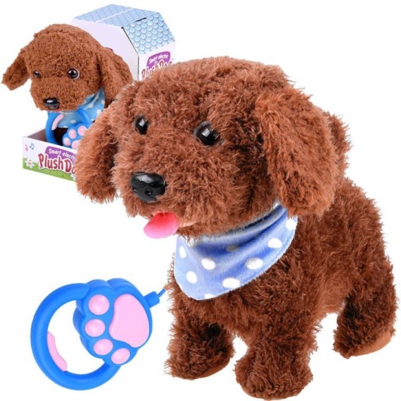 - smycz posiada przycisk, który uruchamia chód pieska, merdanie ogonkiem i odgłosy dźwiękowe, szczekanie