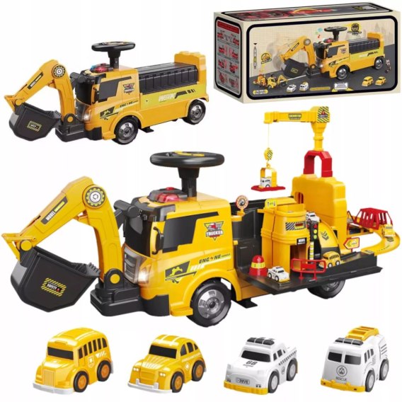Ten wyjątkowy jeździk to doskonały wybór dla każdego małego budowniczego! Zabawka łączy funkcję klasycznego pojazdu do jazdy z możliwością przemiany w interaktywną stację budowlaną z rampami, ruchomym dźwigiem, ramieniem koparki i miniaturowymi pojazdami.