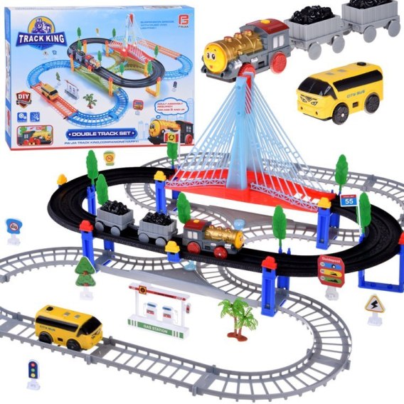 W zestawie: lokomotywa, autobus, wagony, elementy toru, most wiszący, akcesoria (drzewka, znaki, pojazdy)