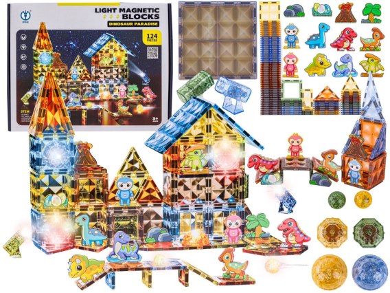 Konstrukcyjne Klocki Magnetyczne Świecące Elementy PARK DINOZAURÓW 124 El.