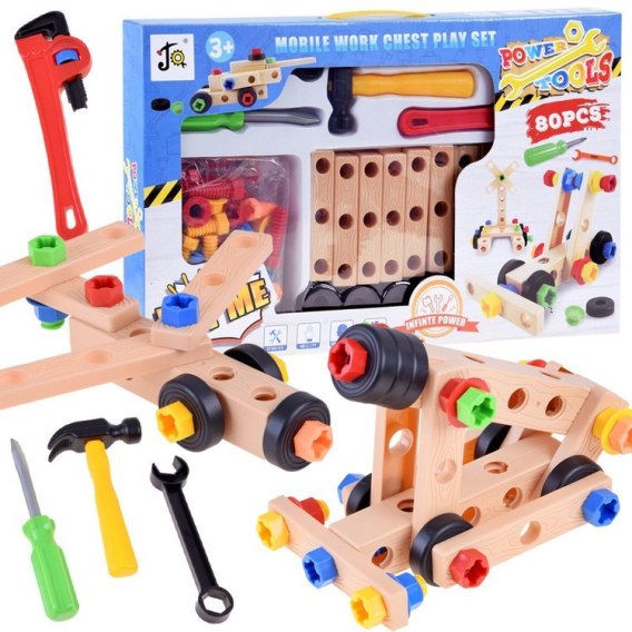 Rewelacyjny 80 elementowy zestaw pozwoli każdemu młodemu konstruktorowi zbudować niesamowite budowle, pojazdy oraz konstrukcje. Potrzebna jest tylko chęć, zapał i wyobraźnia bez ograniczeń. Podstawą konstrukcji jest system dziurek i otworów umieszczonych w głównych elementach konstrukcyjnych, do których dokręcamy kolejne części za pomocą kolorowych śrubek. Kreatywne klocki pozwolą na rozwinięcie wyobraźni przestrzennej, zdolności manualnych oraz koordynacji ruchowej. Poprzez zabawę dziecko ma okazję uczyć się logicznego myślenia, posługiwania się przedmiotami i dopasowywania ich do siebie. Dla rodziców to niezapomniane chwile, które mogą spędzić na wspólnej zabawie ze swoimi dziećmi. Budowle, które można zbudować z klocków to pojazdy, wiatraki, samoloty oraz wiele innych opcji. Klocki oraz narzędzia są wykonane w całości z plastiku.