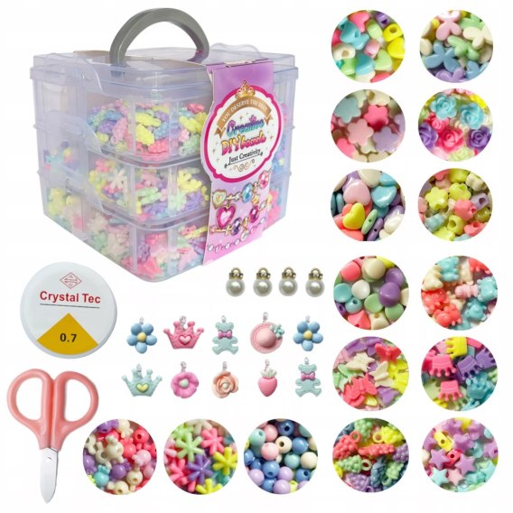 Kreatywny zestaw zawiera bardzo dużą ilość elementów, co pozwoli na wykonanie wielu różnych elementów biżuterii takich jak bransoletki czy naszyjniki. W komplecie są także nożyczki i żyłka do nawlekania koralików, dzięki czemu zawiera wszystko co potrzebne, aby zacząć tworzyć własne projekty.