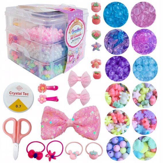 Kreatywny zestaw zawiera wiele elementów, co pozwoli na wykonanie wielu różnych elementów biżuterii takich jak bransoletki czy naszyjniki. W komplecie są także nożyczki i żyłka do nawlekania koralików, dzięki czemu zawiera wszystko co potrzebne, aby zacząć tworzyć własne projekty.