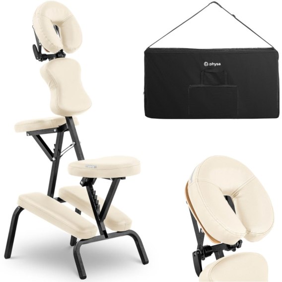 Krzesło marki Physa sprawdzi się w salonie masażu, kosmetycznym czy tatuażu. Przeznaczone zostało do leczenia bolących pleców lub szyi. Konstrukcję krzesła wykonano z solidnej stali o nośności do 130 kg. Przemyślana konstrukcja gwarantuje równomierne rozłożenie ciężaru i stabilność podczas użytkowania. Podłokietnik pomaga przyjąć zrelaksowaną i wygodną pozycję. Tapicerowane powierzchnie zapewniają komfort siedzenia. Wysokość zagłówka jest regulowana w zakresie 1150 - 1350 mm oraz kąt nachylenia -90 - 45deg;. Klęcznik obity został PVC, jest łatwy w utrzymaniu czystości, odporny na olejki i wodę. Składana konstrukcja umożliwia łatwy transport. W komplecie znajduje się torba. Cechy produktu: