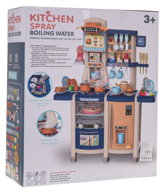 Interaktywna kuchnia z funkcją światła, dźwięku i kranikiem, z którego wydobywa się woda, a także mnóstwem akcesoriów, dla dzieci od 3-go roku życia. Kuchnia została znakomicie wykonana, z najlepszej jakości plastiku i jest w żywych kolorach zachęcających dziecko do zabawy. Na blacie kuchni znajduje się interaktywna płyta z palnikami. Po przekręceniu jednego z pokręteł słychać odgłosy gotowania, a drugiego, odgłosy smażenia. Odgłosom gotowania i smażenia towarzyszy podświetlenie palników. Z kranu faktycznie wypływa woda, jak w prawdziwym zlewie, dziecko będzie mogło umyć zabawkowe naczynia. W zestawie mamy też atrapę lodówki z otwieranymi drzwiczkami i dystrybutorem wody, otwierany piekarnik z efektami dźwiękowymi i świetlnymi, zmywarkę, ekspres do kawy, panel z wentylatorem oraz efektami dźwiękowymi i świetlnymi, telefonik z dźwiękiem i światłem oraz mnóstwo półeczek, na których ułożyć możemy atrapy produktów. Cały zestaw prezentuje się znakomicie. Zabawka zasilana jest bateriami typu 6 x AA 1,5 V (brak w zestawie) oraz 3 x AAA 1,5 V (brak w zestawie).