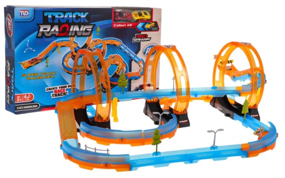Duży, ekstremalny tor wyścigowy z ostrymi zakrętami, pętlami i dwoma szybkimi autkami w zestawie, to propozycja dla dzieci od 3-go roku życia. Zestaw składa się z 48 elementów do samodzielnego montażu. Na torze znajdują się odcinki proste, ostre zakręty z barierkami zabezpieczającymi przed wypadaniem pojazdu z trasy, a także trzy pętle 360 stopni. Pojazdy posiadają napęd pull back.