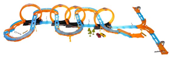 Mega tor wyścigowy z pętlami 360 stopni, ostrymi zakrętami, dla dzieci od 3-go roku życia. Tor wykonano z najlepszej jakości plastiku w żywych kolorach. Na zestaw składa się 74 elementy do samodzielnego montażu. Tor posiada odcinki proste do rozpędzenia pojazdu, 4 pętlę 360 stopni, ostre zakręty i dwa pojazdy. Pojazdy napędzane są napędem pull back. Wystarczy delikatnie nacisnąć pojazd do tyłu, by przejechał tor z pełną mocą.